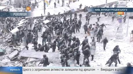 Police this morning rip down barricades to disperse protesters on Hrushevskoho Street near Kyiv’s Dynamo Stadium, in a bid to end a standoff that has claimed one life and injured more than 100 people since Jan. 19. However, after retreating several dozen meters, protesters regrouped and continued the standoff. The image above is a screen shot from Espresso TV’s live feed.