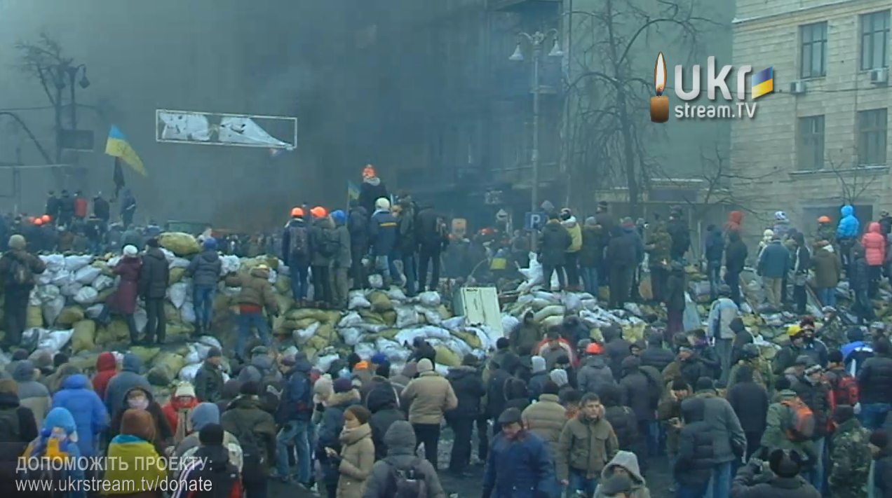 In Kyiv, the tire fires have been burning since last night. Activists that get covered with water from government firehouses are receiving changes of clothes brought to them right to the front lines by other activists. Channel 5 showed footage of tires and supplies of pitchforks, yes pitchforks, being unloaded from activist cargo transport vehicles. Retired Gen. Hrytsenko recommended that those who have registered firearms, wear them on their person if they go to Maidan as the govt is snatching people left and right. He poses the question: “Why should we not defend ourselves?”