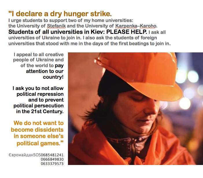 While trying to get home after EuroMaidan on January, 20th (morning) 3 activists – Yukhym Dyshkant, Dmytro Moskalets and Artur Kovalchuk were stopped and beaten by 12-15 ‘titushky’ near Holodomor Monument. After calling the police, a bus with “Berkut” policemen approached and after all, what has happened, these activists – not the ones who beat them – were brought to Desnyanskyi police department and are now arrested. On January, 21st (evening) the court took the decision about the measure of detention for Yukhym Dyshkant during investigation – 2 months of arrest.