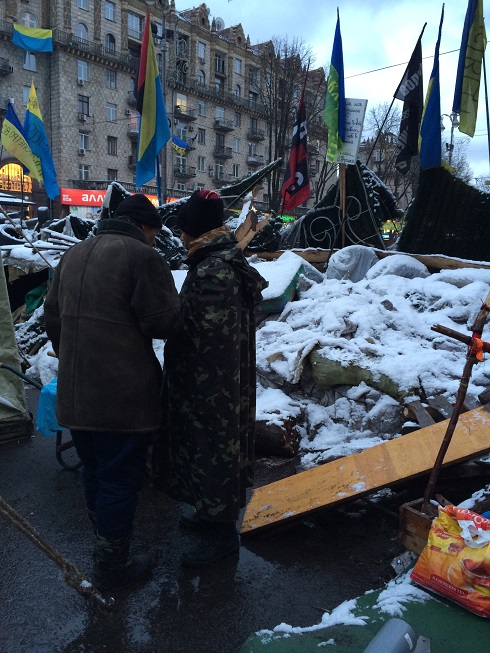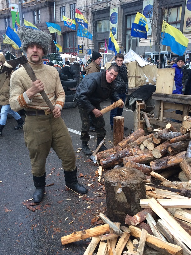I met Mikhail at Maidan several days ago. He was chopping wood and was happy to chat with me until one of the cossacks threw a snowball at his back and told him to watch what he was saying.