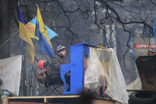 He’s actually being referred to as the “Pianist-Extremist” — a nod to the Ukrainian Interior Minister Vitali Zakharchenko saying protesters would be treated as extremists if they defiantly remain on the streets of the capital.