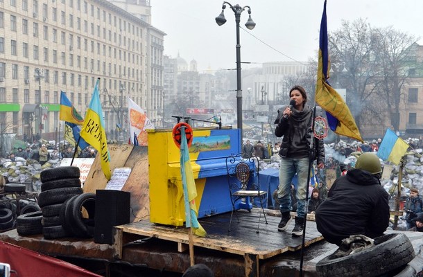 Ukrainian musician and singer Ruslana Lyzhychko known as Ruslana, a World Music Award winner and MTV Europe Music Award nominated artist, performs on an anti-government barricade in central Kiev during a concert organized for the activists and the policemen on February 10, 2014. Ruslana also won the Eurovision Song Contest in 2004. AFP PHOTO / SERGEI SUPINSKY