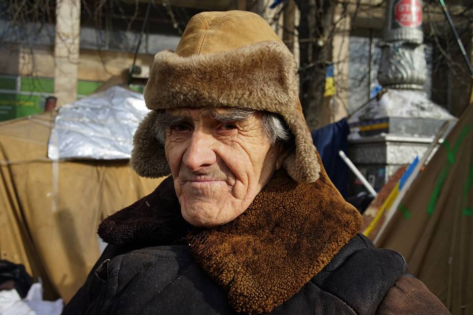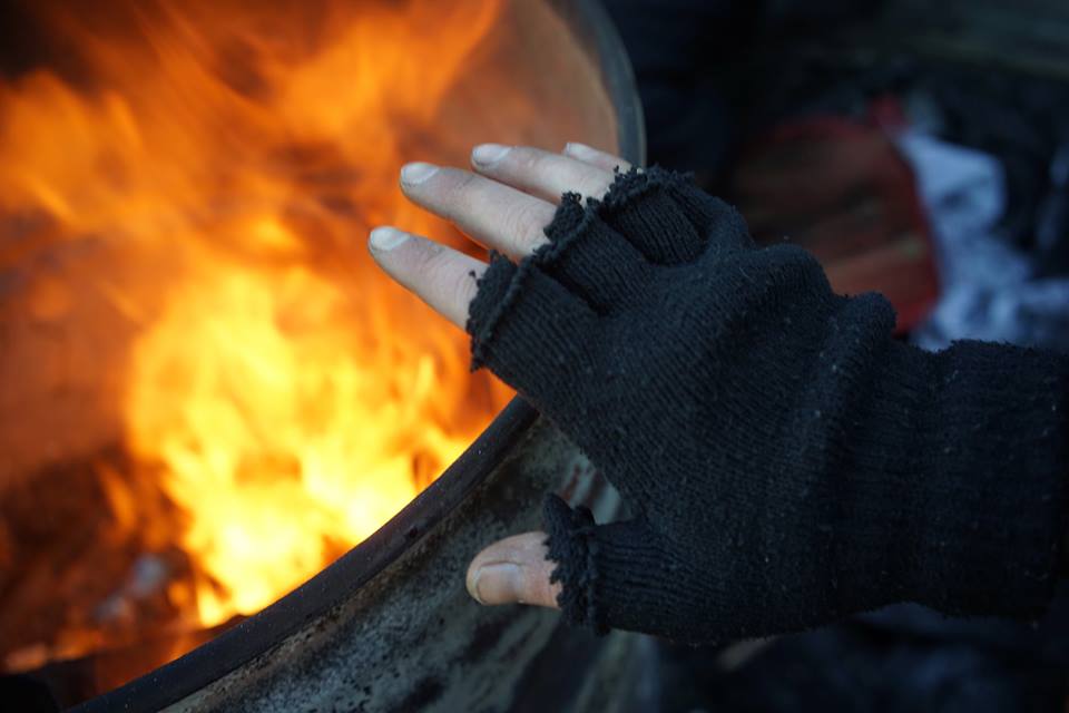 This man invites people into a ‘warm-up’ tent in Independence Square. Inside there are two wood burning stoves.
