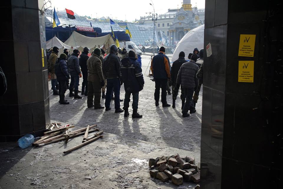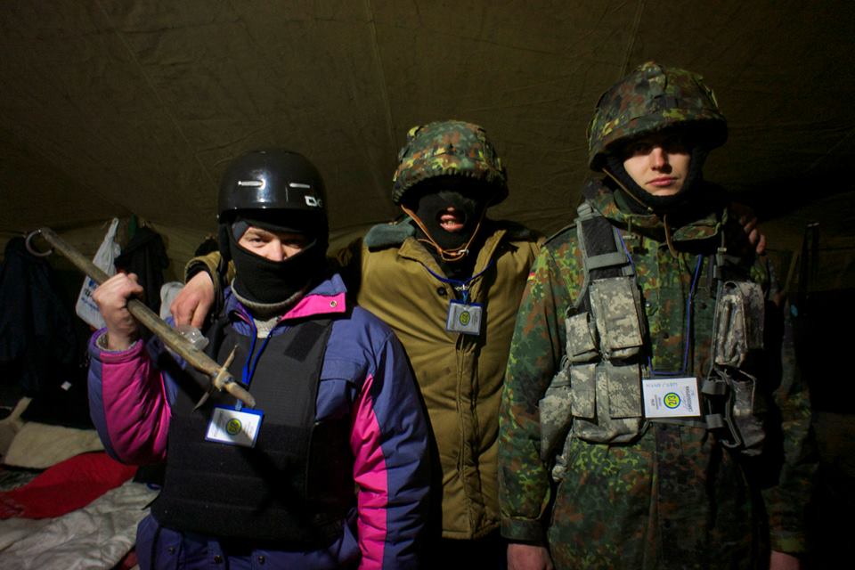 In a tent in Independence Square, protestors prepare to head to the frontlines of ‘European Square.’ All those who wish to engage in manning the barricades have to be cleared and given passes by EuroMaidan organizers.