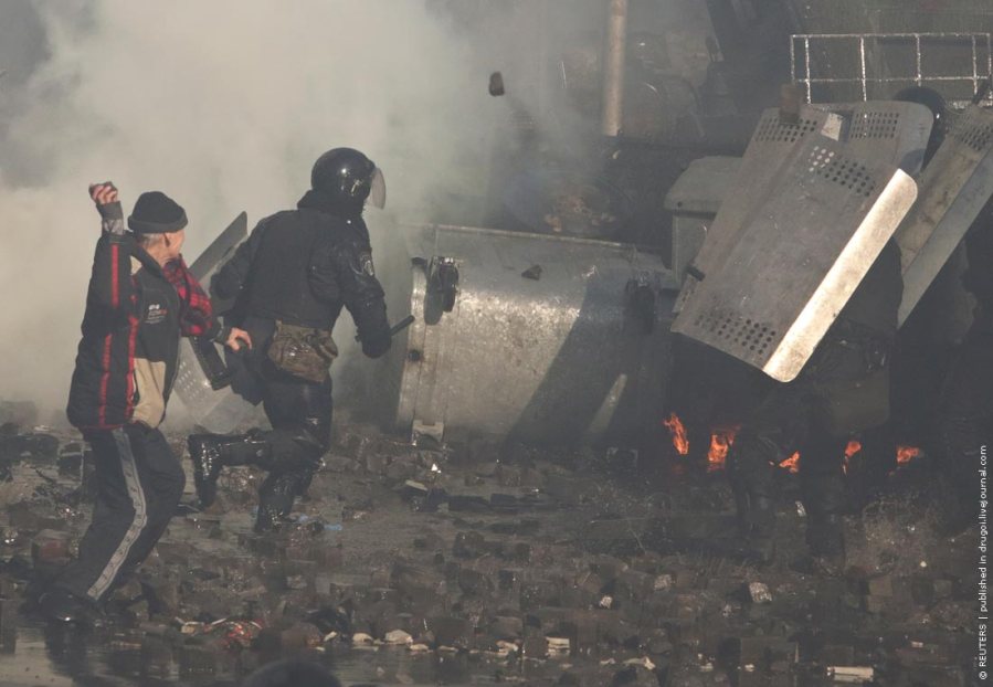 A protester throws stones towards Interior ministry members during clashes in Kiev February 18, 2014. Anti-government protesters clashed violently with police in central Kiev on Tuesday, a day after Moscow moved to cement its influence over Ukraine with $2 billion in cash to shore up the former Soviet state’s heavily indebted economy. A parliamentary deputy said on Facebook that three demonstrators had been killed, and Ukrainian television said five protesters had been hurt in the clashes. Neither report could immediately be confirmed. REUTERS/Konstantin Chernichkin (UKRAINE – Tags: POLITICS CIVIL UNREST) – RTX191T7
