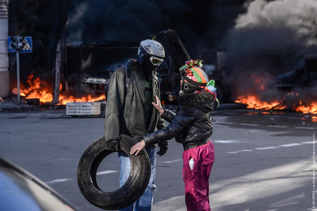 People speak near a barricade on fire during clashes between anti-government protesters and Interior Ministry members in Kiev February 18, 2014. Several thousand anti-government protesters clashed with police near Ukraine’s parliament on Tuesday, torching vehicles and hurling stones in the worst violence to rock the capital Kiev in more than three weeks. REUTERS/Andrew Kravchenko/Pool (UKRAINE – Tags: POLITICS CIVIL UNREST) – RTX191RI
