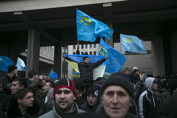 Crimean Tatars hold flags during rallies near the Crimean parliament building in Simferopol February 26, 2014.