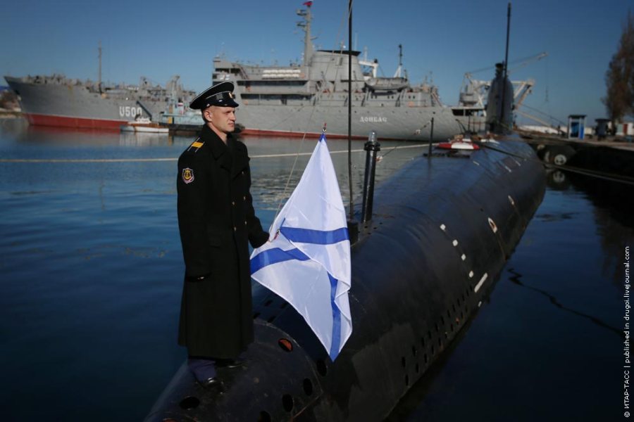 поднятие российских флагов на бывшей украинской подлодке “запорожье” в стрелецкой бухте на бывшей украинской ремонтной базе