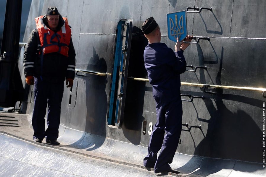 Россия. Севастополь. 22 марта. Снятие герба Украины с бывшей украинской подлодки “Запорожье” на бывшей украинской ремонтной базе в Стрелецкой бухте. Российские военные готовят подлодку для буксировки в российскую часть Черноморского флота. Фото ИТАР-ТАСС/ Станислав Красильников