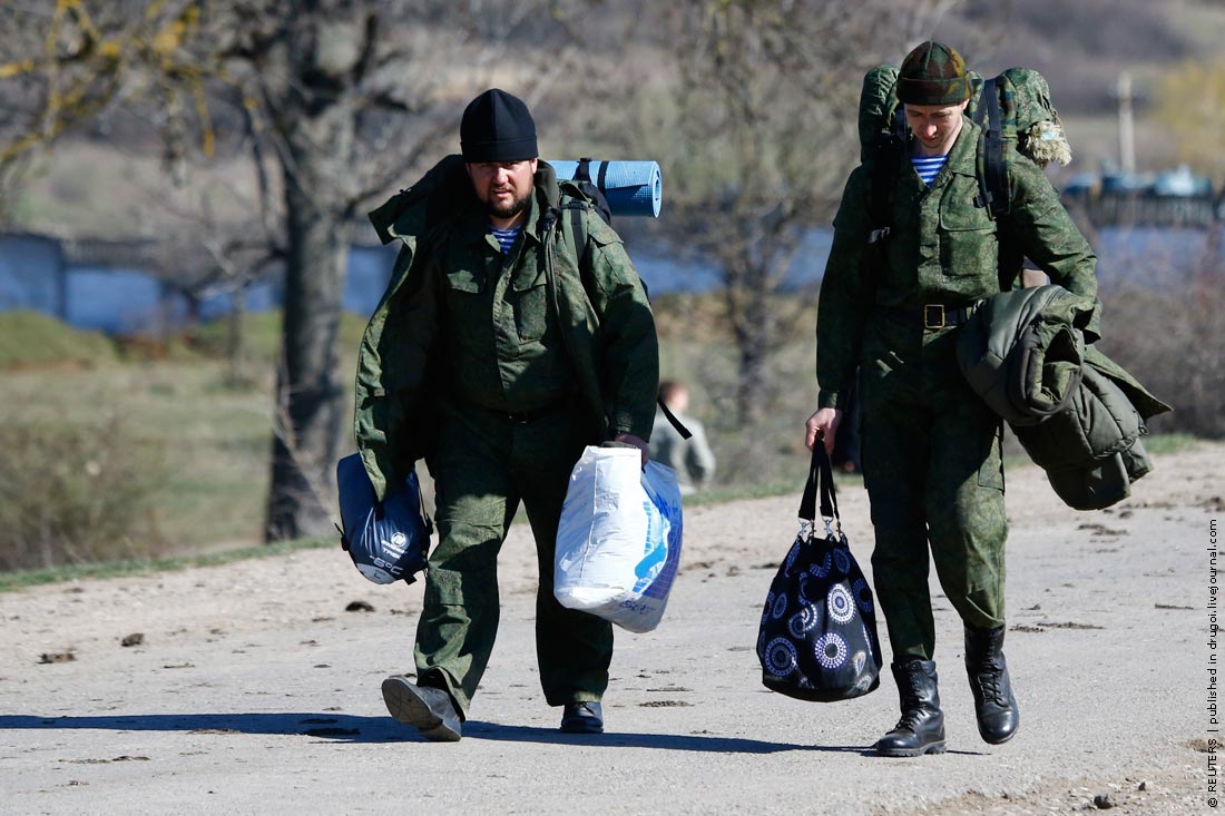 A military priest (L) and a uniformed man, believed to be a Russian servicemen, march outside a military base in Perevalnoye, near the Crimean city of Simferopol, March 21, 2014. Unlike the unmarked masked soldiers who first seized Crimea three weeks ago, Russian paratroopers strolling across a field near the peninsula’s Perevalnoye military base, which they took over on Friday, wore their trademark blue berets and red star cockades. REUTERS/Shamil Zhumatov (UKRAINE – Tags: POLITICS MILITARY) – RTR3I1MA