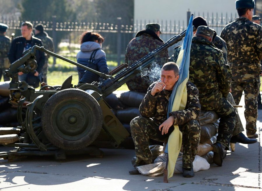 A Ukrainian serviceman holds a flag of Ukraine and smokes at a military base in the Crimean town of Belbek, near Sevastopol March 22, 2014. Russian troops have surrounded the Ukrainian airbase in Crimea and issued an ultimatum to forces inside to surrender, the deputy commander of the base in Belbek, near Sevastopol, said on Saturday. REUTERS/Shamil Zhumatov (UKRAINE – Tags: POLITICS MILITARY TPX IMAGES OF THE DAY) – RTR3I53X