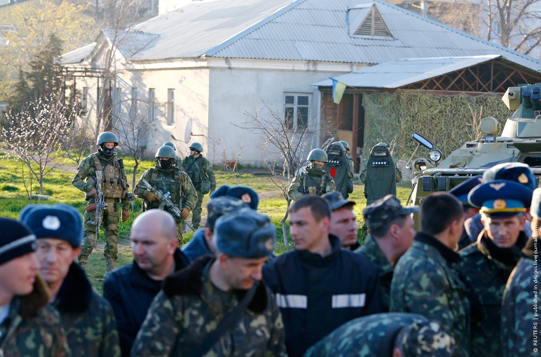 Armed men, believed to be Russian servicemen, stand guard, with Ukrainian servicemen seen in the foreground, at a military airbase, in the Crimean town of Belbek near Sevastopol March 22, 2014. The commander of Belbek airbase in Crimea said on Saturday he would be taken away by Russian forces for talks after they entered the base with armored vehicles and automatic rifles. REUTERS/Shamil Zhumatov (UKRAINE – Tags: POLITICS MILITARY) – RTR3I5FW