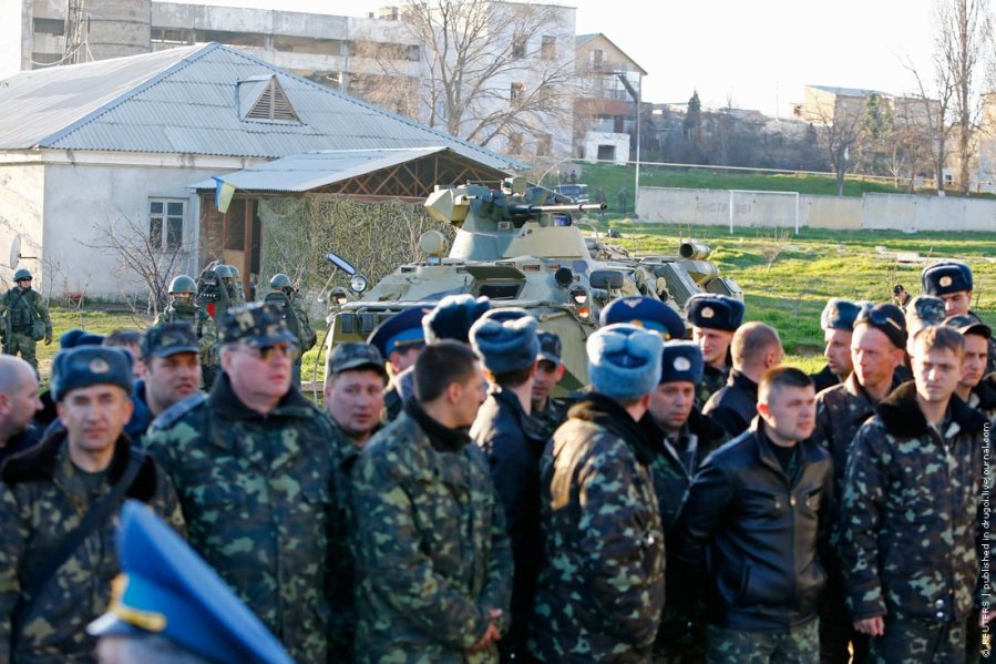 Armed men, believed to be Russian servicemen, stand guard, with Ukrainian servicemen seen in the foreground, at a military airbase, in the Crimean town of Belbek near Sevastopol March 22, 2014. Russian troops forced their way into a Ukrainian airbase in Crimea with armored vehicles, automatic fire and stun grenades on Saturday, injuring a Ukrainian serviceman and detaining the base’s commander for talks. REUTERS/Shamil Zhumatov (UKRAINE – Tags: POLITICS MILITARY) – RTR3I5RN