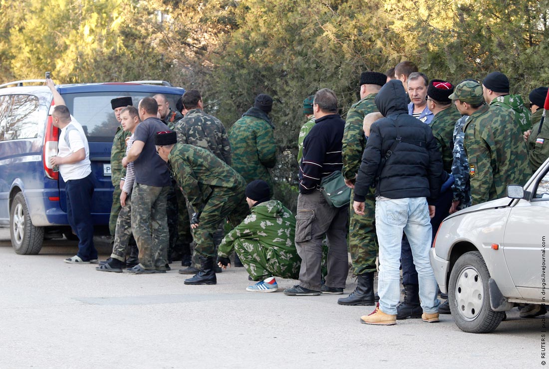 Members of pro-Russian self-defence units take cover behind cars outside a military base in the Crimean town of Belbek near Sevastopol March 22, 2014. The commander of Belbek airbase in Crimea said on Saturday he would be taken away by Russian forces for talks after they entered the base with armored vehicles and automatic rifles. REUTERS/Vasily Fedosenko (UKRAINE – Tags: POLITICS MILITARY) – RTR3I5JO