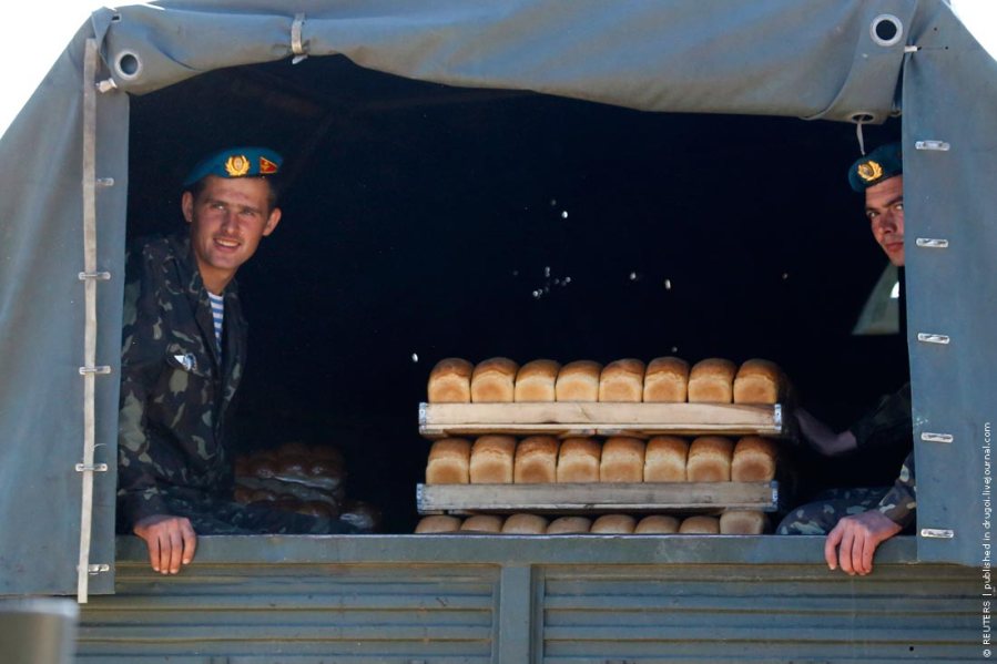 Ukrainian troops look out from a truck carrying provisions at a military base in Perevalnoye, near the Crimean city of Simferopol, March 21, 2014. Unlike the unmarked masked soldiers who first seized Crimea three weeks ago, Russian paratroopers strolling across a field near the peninsula’s Perevalnoye military base, which they took over on Friday, wore their trademark blue berets and red star cockades. REUTERS/Shamil Zhumatov (UKRAINE – Tags: POLITICS MILITARY) – RTR3I1LV