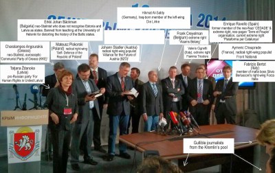 Why would Chauprade deny this? The answer is obvious: the French National Front tries to distance itself from the extreme right and neo-Nazism, while Marine Le Pen has long been trying to present her party as non-extremist. Chauprade‘s visit to the illegitimate Crimean “referendum” on the invitation from the EODE undermines the National Front‘s “moderated, respectable image” in the run-up to the elections to the European Parliament.