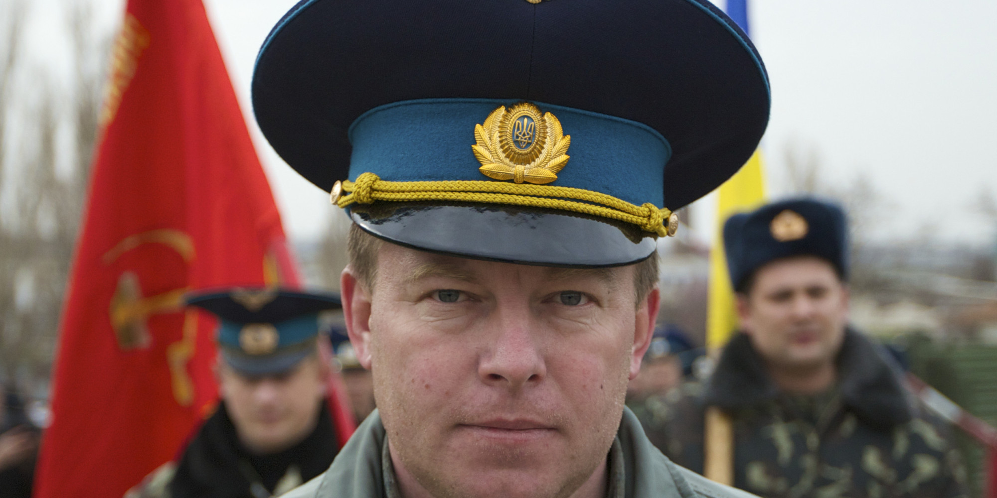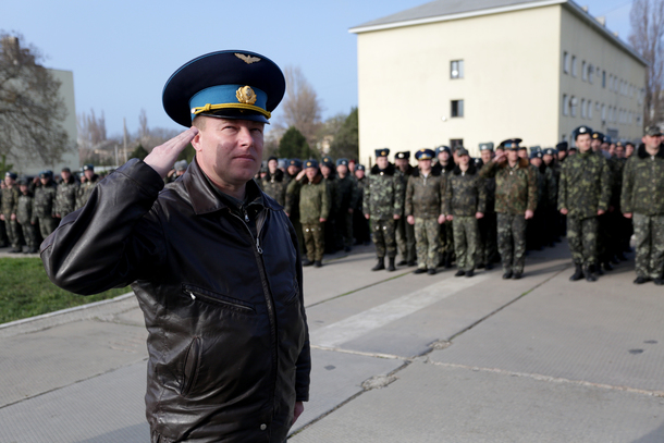FILE – In this Tuesday, March 4, 2014 file photo, Air Force Col. Yuliy Mamchur, commander of the Ukrainian Belbek Air Base, leads his men to the base outside Sevastopol, Ukraine. The day after Crimeans voted to leave Ukraine and join Russia, a man in a black raincoat turned up at the gate of the Belbek Air Base to demand that the Ukrainian forces holed up inside surrender to Russia. The Ukrainian commander of the base came out proudly wearing his visor cap decorated with gold wings – and refused. Having withstood five days of sustained intimidation and pressure to defect from his captors, Mamchur now awaits a heros welcome in the capital, Kyiv. (AP Photo/Ivan Sekretarev, File)