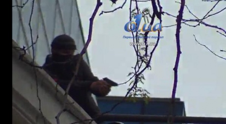 So, während der Übertragung vor Ort filmte das Fensehteam des Odessa Fensehsenders o1.ua, wie ein Separatist vom Dach des Einkaufszentrums “Afina” in die Menge schoss.