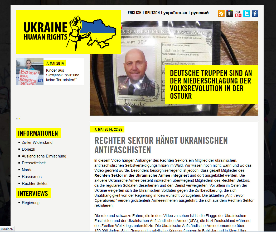 Den Begriff Skrupellosigkeit muss ich leider gleich vom vorigen Beitrag für die Website übernehmen, auf die ich gerade zufällig gestoßen bin. Das Design ist kaum von Amnesty International zu unterscheiden. Dies entspricht dem gleichen zynischen Muster das man schon aus Syrien kennt. Menschenrechtsorganisationen werden in ihrer Integrität erschüttert und gleichzeitig wird deren vorhandene Integrität benutzt, um die Propaganda glaubwürdiger zu machen. Mit so etwas werden Menschen erfolgreich dazu gebracht andere Menschen zu töten. Es reicht, einige Interviews mit Assads Soldaten zu sehen. Auf die Frage warum sie das tun, bekommt man ausnahmslos derartige Propaganda zu hören. Putins Propaganda at its worst:
