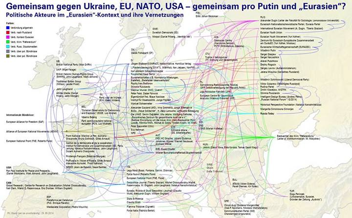 Interessant in diesem Zusammenhang, und vor allem hinsichtlich der „fünften Kolonne“, von der Dugin spricht, ist sein Netzwerk in Europa – hier eine Grafik: