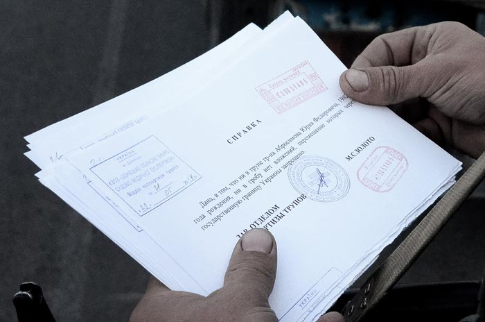 I glance over an officer’s shoulder, “Donetsk Regional Bureau of Forensic and Medical Expertise. 05.29.2014. This paper certifies that neither the corpse of Mr. Zhdanovich, Sergei Borisovich, DOB 1966, nor the coffin contain any items whose movement across the state border of Ukraine is prohibited.”