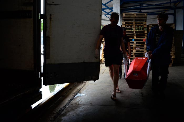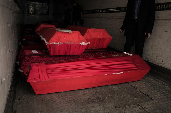 As it turned out, the bodies of the dead had been transferred the day before from the morgue to refrigerators at an ice cream factory. That was where they were supposed to be put into coffins and prepared for transport to Russia. The truck with the coffins drove to the factory grounds, and the gates were shut. In a secluded corner, fenced-off by wooden pallets from the prying eyes of the factory workers, the activists hastily carried the bodies out from the refrigerated chamber, gathered body parts, put the remains into black bags, then into the colorful coffins, smoked, looked around, and loaded the coffins into the semi. At the same time, other activists painted the sides and roof of the truck with red crosses and the digits “200.”
