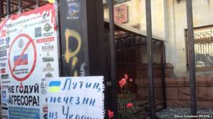 “Den Angreifer nicht füttern! Putin, raus aus der Ukraine!” Einige der Demonstranten vor der russischen Botschaft zertrümmerten am Samstag Abend Autos, warfen Eier usw. auf das Gebäude.