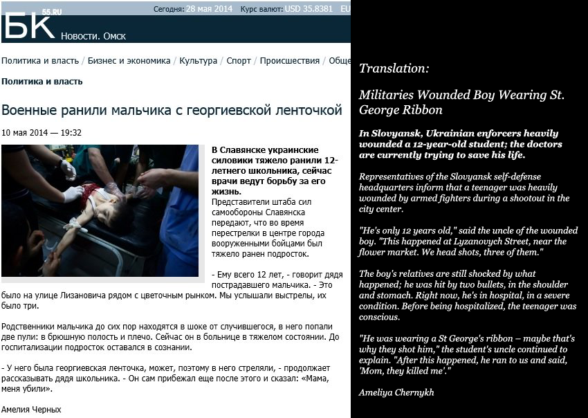 Earlier, the same photo was used by some Russian media, claiming that the boy was wounded in Sloviansk on May 10. (The article is still up at BK55.ru.)