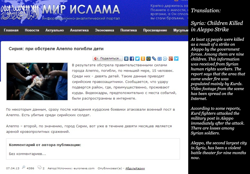 But the truth is, the photograph is entirely unrelated to any of the events in Donetsk or Sloviansk. The photo was taken over a year ago, in April 2013, in Aleppo, Syria, when the city and its peaceful residents were shot at by the government forces of Bashar Assad. (See the news piece at the Islamic World portal.)