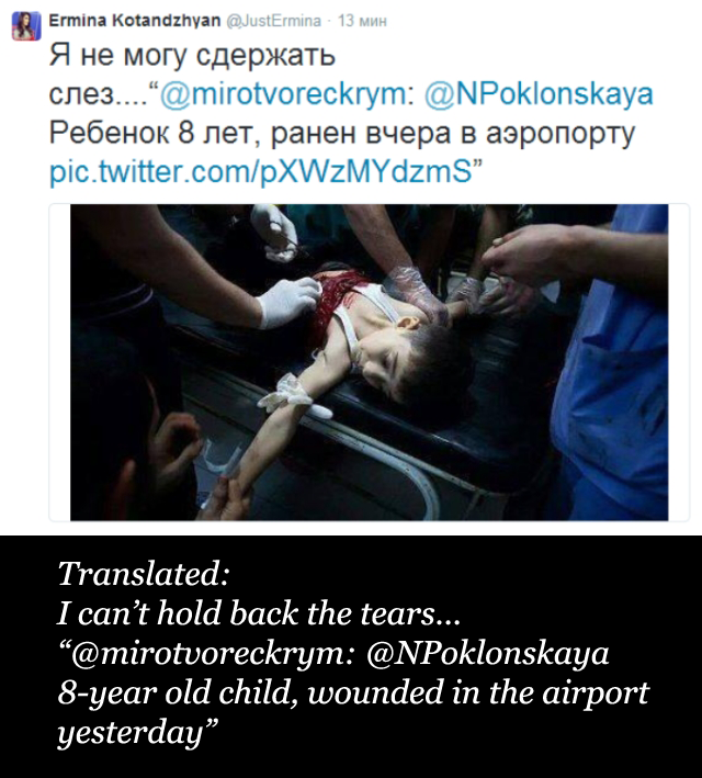 Using children in reports is one of the most popular tactics of Russian media. On May 27, Ermina Kotandzhyan, a journalist of the Russian LifeNews channel, published a photograph of an 8-year-old boy, allegedly killed by Ukrainian militaries in the Donetsk airport.