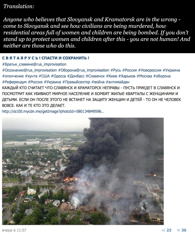 Separatist groups in social networks spread around a shocking picture of “powerful explosions in Slovyansk,” claiming that they happened in residential quarters and imploring to protect women and children. The picture, with some passionate captions, was posted in all social networks.