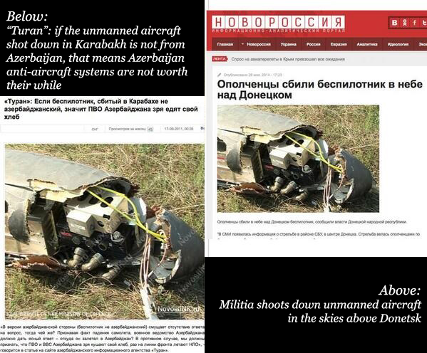 Russian media spread around a photograph of an unmanned scouting aircraft, supposedly shot down by the separatists in Donetsk Oblast. (As reported by Novorossiya Information Agency.)