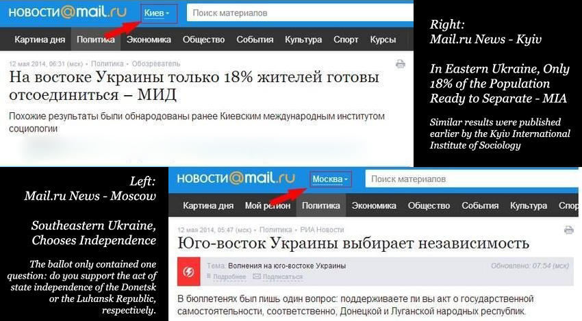 Some Russian media go as far as to present news differently for different cities. For example, here, news for Kyiv and for Moscow were presented in strikingly different contexts.
