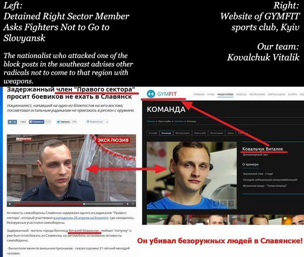 LifeNews, a media agency infamous for its lies, was the first one to find out about Right Sector fighters that allegedly came to Donbas to destabilize the situation. One such “Ukrainian nationalist” “captured” in Donbas is actually a fitness trainer from Kyiv. Donetsk separatists, however, introduced him as Vitaliy Kovalchuk, a Right Sector fighter from Vinnitsya.