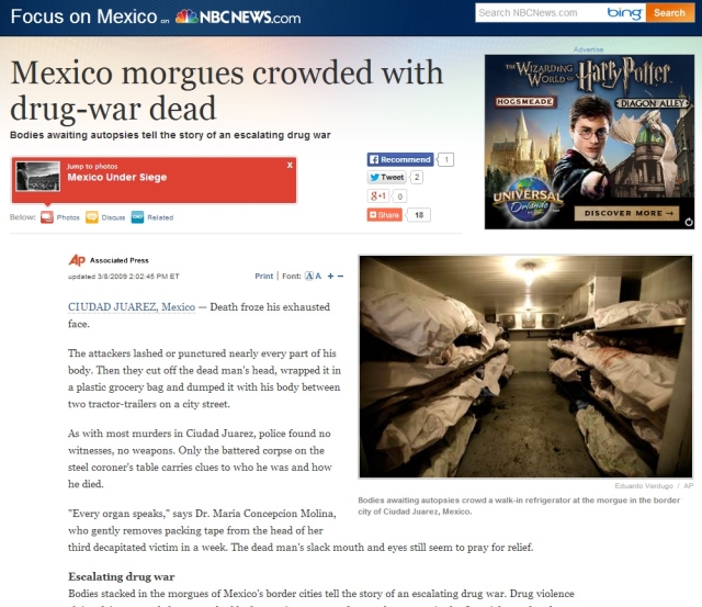 In reality, the photograph above was taken by an Associated Press journalist, five years ago (February 18, 2009), in the morgue of a Mexican city. The bodies were the result of a deadly drug war.
