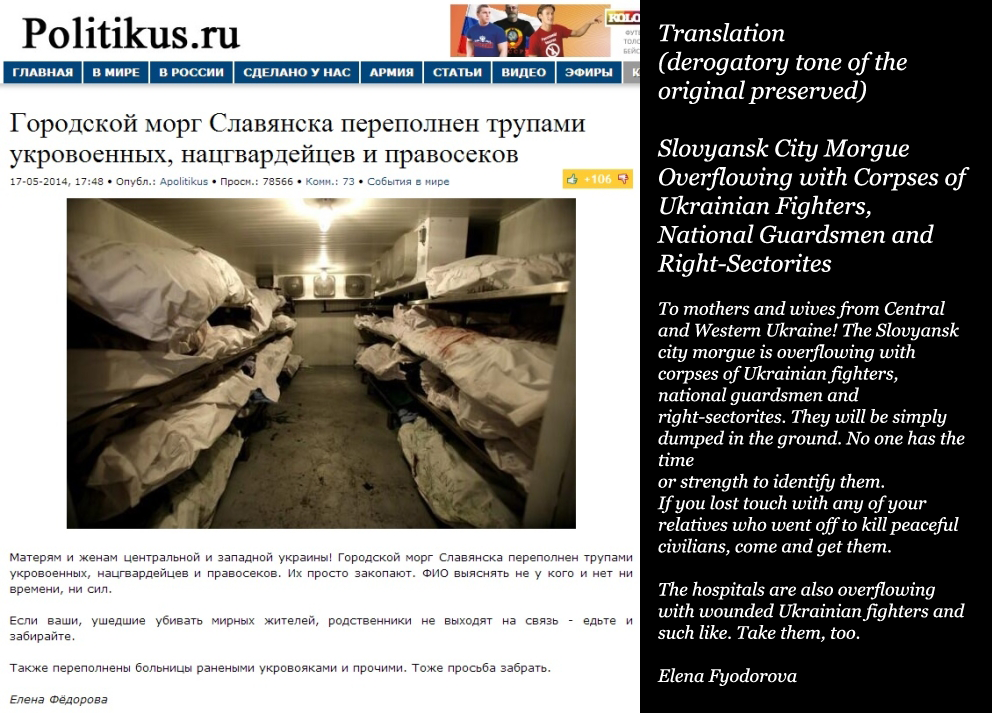 A number of Russian media, journalists and bloggers posted photographs that were allegedly taken in a morgue in Sloviansk, of corpses of Ukrainian militaries, fighters of the National Guard, and Right Sector members. Supposedly, they are all going to be “dumped in the ground” without identification.