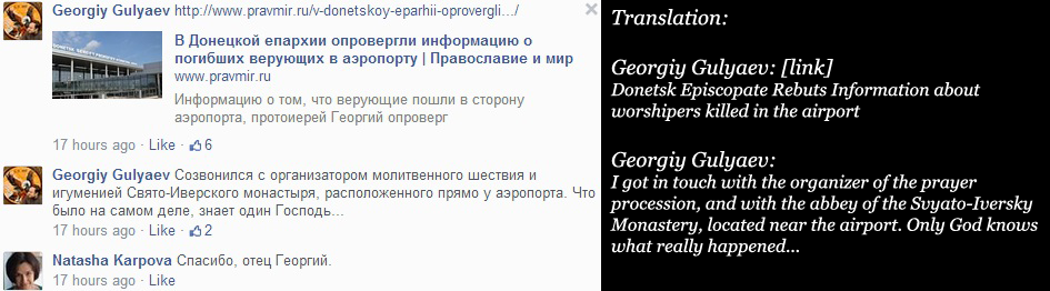 Following this report, the Donetsk Episcopate denied both the prayer procession to the airport and the deaths of its participants. The first response on this came from Archpresbyter Georgiy Gulyayev, press-secretary of the Donetsk Episcopate, who posted a link to the rebuttal in social networks.