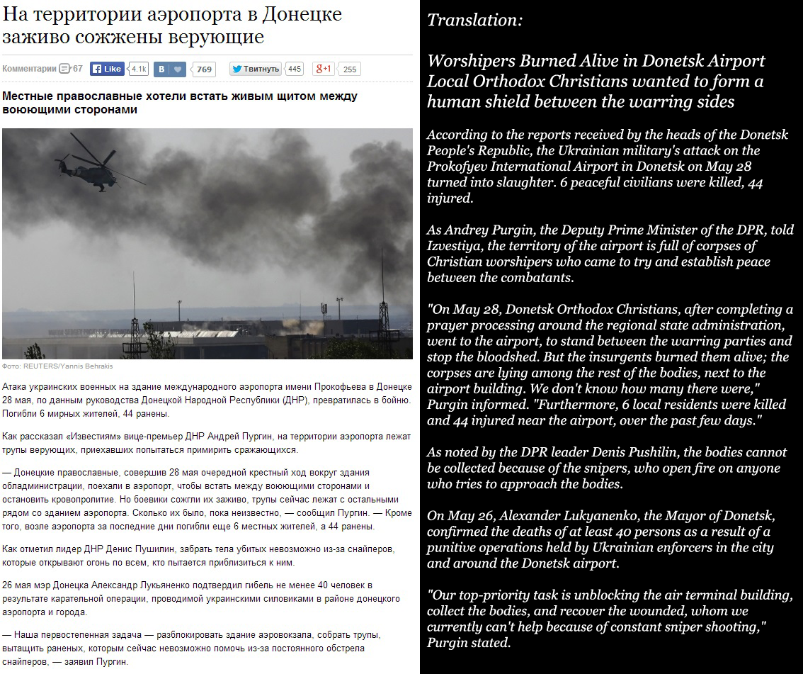 Russian media, including Izvestiya (http://izvestia.ru/news/571605) were spreading reports that Orthodox Christian believers who came to the Donetsk airfield on May 28, “to prevent bloodshed,” were burned alive. The media claimed to get their information from Andriy Purgin, “Deputy Prime Minister” of the so-called “Donetsk People’s Republic.”