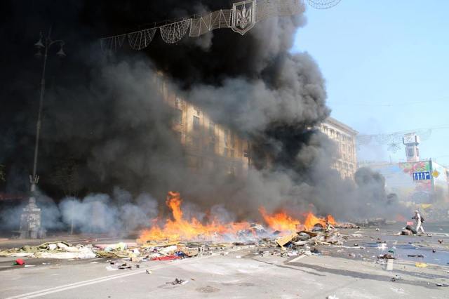 Two heavily armed battalions of Ukrainian military troops (Kyiv 1 and Kyiv 2) and riot police (hundreds in total) attempted to “restore order” to Ukraine’s pro-democratic protest camp in the center of Kyiv this morning on Maidan Nezalezhnosti [Independence Square, called Maidan]. Their attempts failed after people pushed them back. Thankfully, the incident was mostly peaceful and few injuries were witnessed. However, government forces destroyed over 10 large protest tents with fire. Tires were also lit on fire by protesters who do not want to leave their encampments on Maidan.