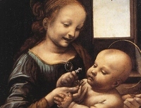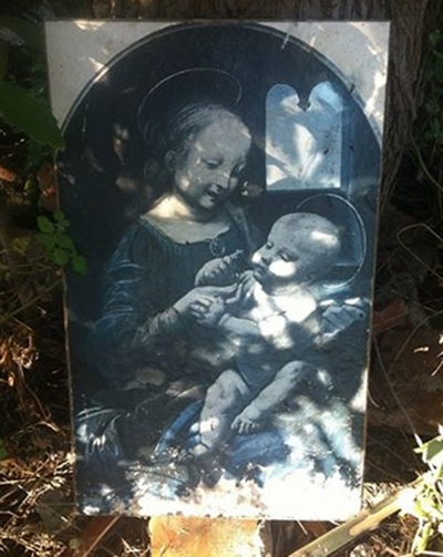We saw a big portrait in the bushes. From a distance, it seemed to us to be an image of Bandera or Gogol. But when our cameraman went closer, he was surprised to find that in the bushes, amidst cartridges and other debris, was lying a reproduction of the “Madonna and Child” (The Benois Madonna) by Leonardo da Vinci. Everything about it was surprising—that such a large portrait of the Virgin was lying about getting dirty in the bushes, and that the grandmothers, who were sitting next to this checkpoint (Lysychansk had already been liberated) were not interested in it. In the end, we put our find in the trunk of the car and drove on.