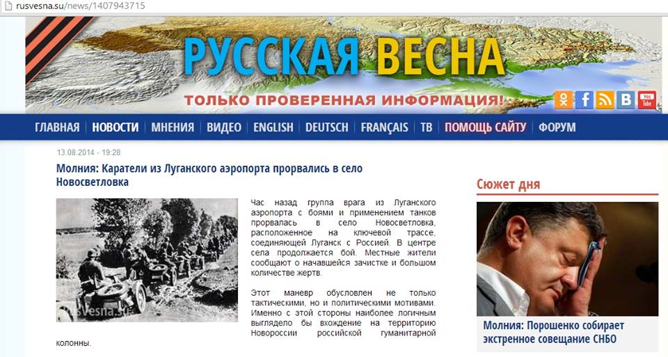 Am 13. August um 19:30-20:00 Ortszeit begann die Mehrheit der Informationskanäle der russischen Terroristen (Gruppen in Sozialen Medien, Foren, Zello Kanäle [Kurzstreckenfunk]) mit massiver Desinformation. Nach dieser falschen Nachricht brachen die ukrainischen Truppen angeblich aus dem Gelände um den Flughafen Luhansk in Kämpfen und sind mit Panzern (!) zum Dorf Nowoswitliwka an der wichtigen Hauptstraße M04 vorgestoßen, die Luhansk mit Russland verbindet.