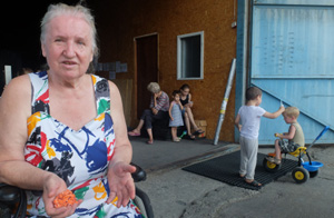 Several disabled people are moving around the hangar in wheelchairs. I notice an elderly woman in a bright dress, missing both legs above the knees. Anna Petrivna, 70, came here from Luhansk on July, 10. She is virtually the only Ukrainian-speaking person in the camp.