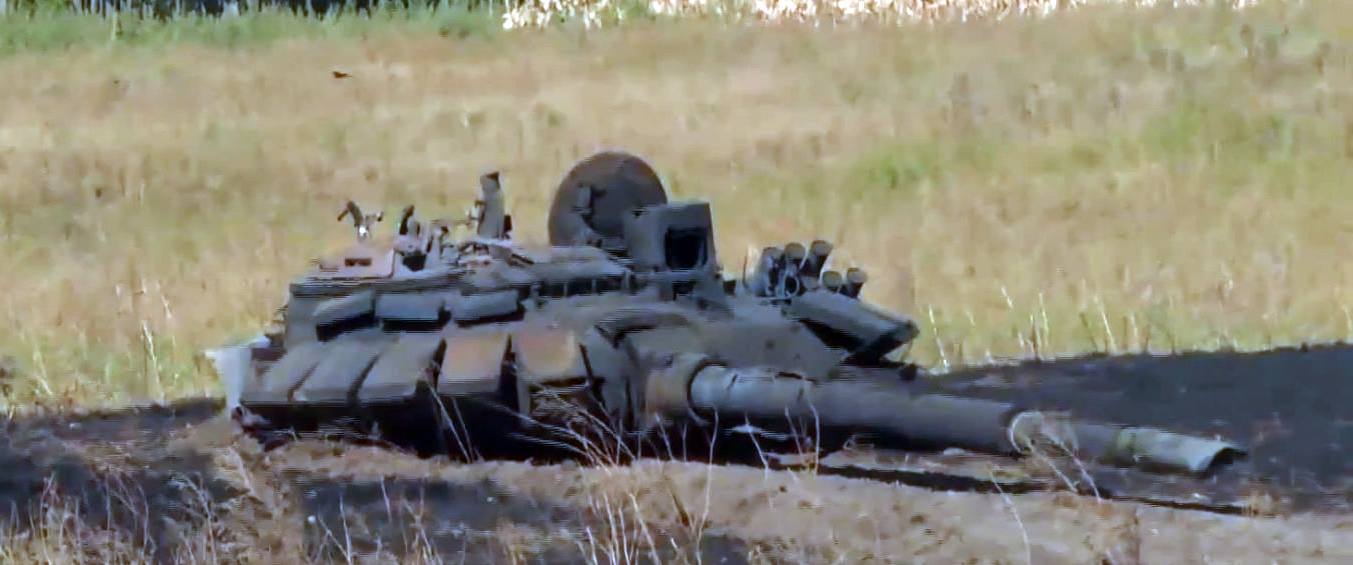 The following pictures present more results of the battles for Novosvitlivka. Photo N6 shows a tank turret separated from the body as a result of internal blast. It belongs to T-72B3 , the latest tank model put into operation in the Russian Federation army in 2012. This particular specimen must have been destroyed by Ukrainian tankmen from the First Tank Brigade. A distinguishing feature of T-72B3 is the sighting device installed on the turret – Sosna-U, made in Belarus and never exported.