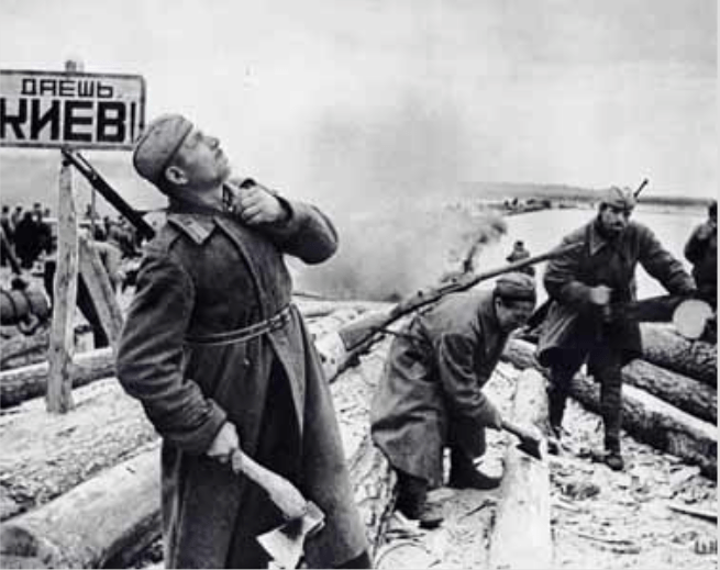 Construction of the crossing at the Kyiv offensive. Sign says “Onward to Kyiv.”