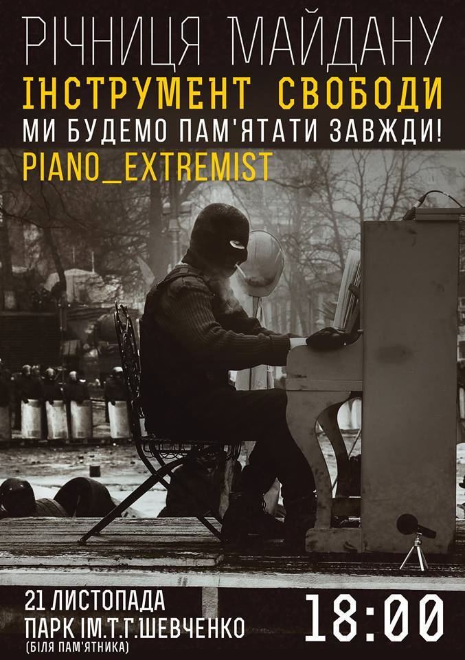 “Anniversary of Maidan. The instrument of freedom. We will always remember.” “Nov. 21. T. Shevchenko Park (near the memorial monument) 6pm.”