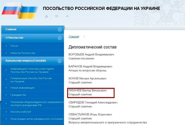 Victor V. Likhachev (allegedly an “independent observer”) is a senior advisor … at the Russian Embassy in Ukraine. The official Embassy website listed him in this capacity. He “was” listed, because as of November 14, 2014, this page has been blocked (by a strange coincidence, the IR group got interested in Likhachev and was seeking comments from his colleagues at the time); however, it is still visible in the Google search engine cache (see screenshot).