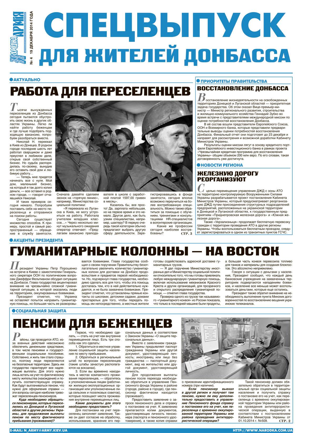 Donbas special issue of Narodna Armiya. Headings: “Jobs for migrants,” “Humanitarian convoys – eastwards,” “Pensions for refugees,” “Restoration of Donbas.”