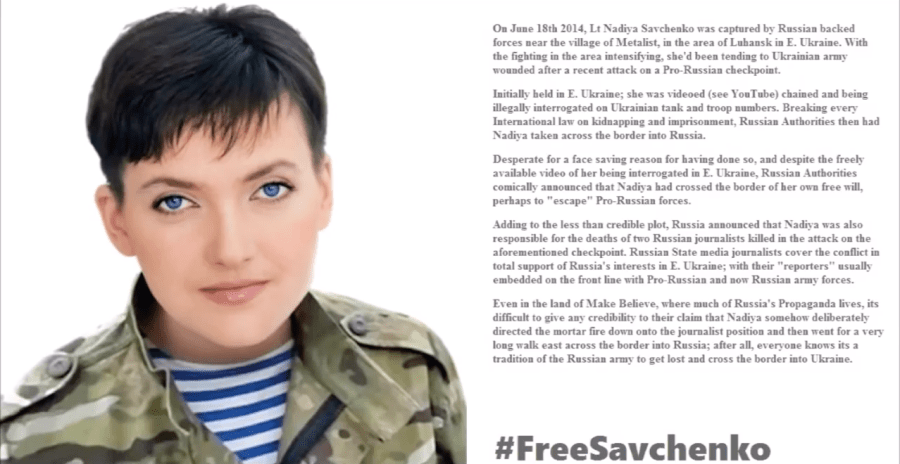 Свободу – Надежде Савченко! Гражданке и защитнице Украины, которую выкрало и держит в застенках чужое государство-агрессор Россия.