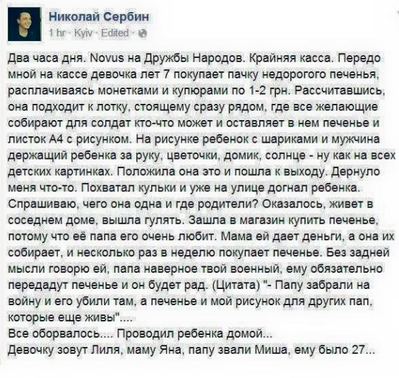 2 pm. Novus [supermarket] located at Druzhby Narodiv [boulevard in Kyiv]. Last cash register. At the checkout in front of me is a girl about seven years of age, buying a pack of inexpensive cookies, paying with coins and 1- or 2-Hryvnia bills. When she’s done [at the register], she approaches a tray set up immediately nearby, where everyone willing [to help Ukrainian soldiers] can contribute what they can, and leaves the cookies and a sheet of paper with a drawing on it. On the picture, there is a child with balloons and a man holding the child by the hand, [there are] flowers, a house, sun – just like all the other children’s pictures have [on them]. She put all of this [on the tray] and went to the exit. Something drew me [out]. I grabbed the bags and caught up with the child out on the street. I ask her, why is she alone, and where are her parents? It turned out, she lives next door, and that she went out for a walk. She went to the store to buy some cookies, because her dad loves them a lot. Her mom gives her an allowance, and she collects it, and several times a week [she] buys the cookies. Without a second thought, I tell her that her dad is probably with the military, and they will surely give him the cookies, and that he will be happy.