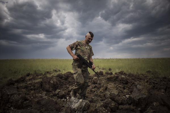 A Ukrainian serviceman investigates a crater left by a Grad rocket in the village of Toshkivka, (NW of Stanytsia Luhansk) in eastern Ukraine. Photo: Evgeny Maloletka. Source